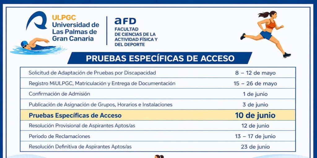 Ya están disponibles las fechas clave del proceso de acceso 🗓️👇 📌 Solicitud de adaptación por discapacidad: 8 – 12 de mayo📌 Registro MiULPGC, matriculación y entrega de documentación: 15 – 26 de mayo📌 Confirmación de admisión: 1 de junio📌 Publicación de asignación de grupos, horarios e instalaciones: 3 de junio📌 Pruebas específicas de acceso: 10 de junio📌 Resolución provisional de aspirantes aptos/as: 12 de junio📌 Periodo de reclamaciones: 13 – 17 de junio📌 Resolución definitiva de aspirantes aptos/as: 23 de junio 💻 Para más información consulta el apartado de pruebas específicas en nuestra web:https://afd.ulpgc.es/acceso-y-pruebas-especificas/ 📢 Organízate con tiempo y no dejes pasar ninguna fecha clave. #ULPGC #AFD #PruebasAcceso #CienciasDelDeporte #Junio2026